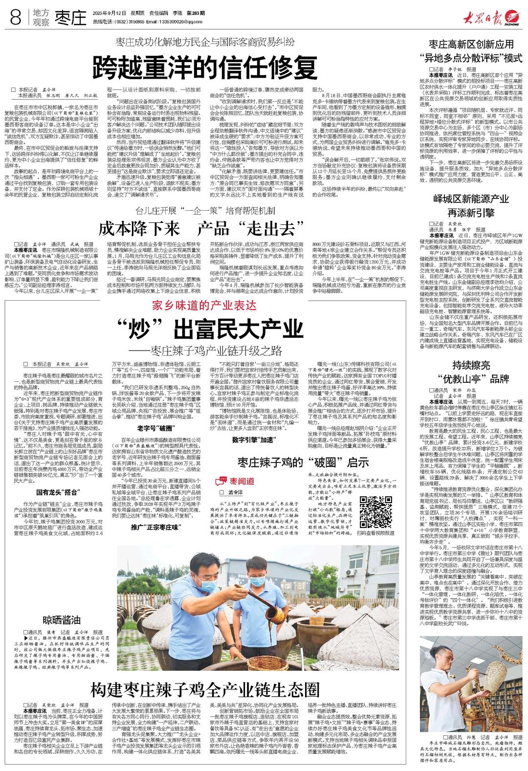 近年来,枣庄把新型商贸物流产业链作为“6+3”现代产业体系的重要组成部分,育企业、上项目、树品牌,持续推动产业链做大做强。特别是对枣庄辣子鸡产业发展,枣庄市委、市政府高度重视、专题调研、部署推进,出台《关于支持枣庄辣子鸡产业高质量发展的若干措施》,为产业提质增效注入强劲动能。