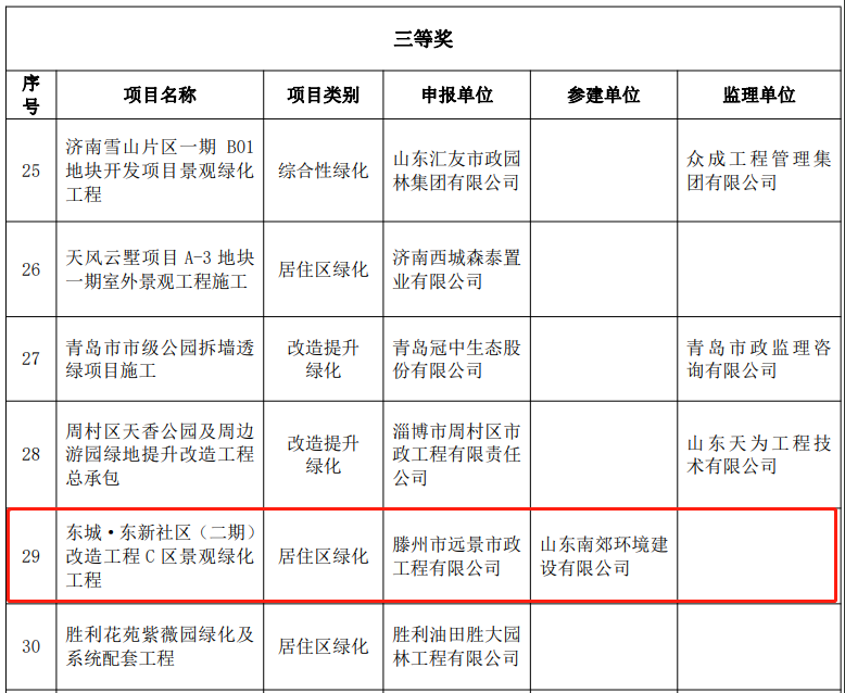 12月15日,由山东省建设工会、山东省园林绿化行业协会联合组织的2023年度“园林优质工程”优秀成果竞赛评选结果揭晓,由信华发展公司投资、远景市政公司承建的信华城·珹园(又名:东城·东新社区(二期)改造C区)景观绿化工程,荣获山东省园林绿化行业2023年度“园林优质工程”三等奖。