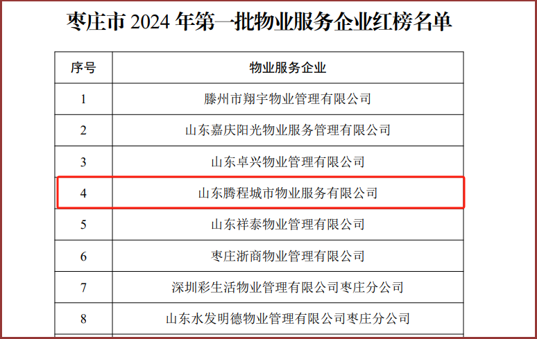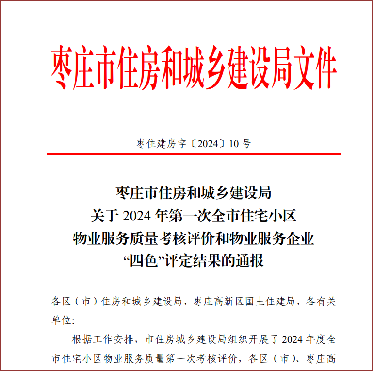 近日,枣庄市住房和城乡建设局公布了《2024年第一次全市住宅小区物业服务质量考核评价和物业服务企业“四色”评定结果》,山东腾程物业服务有限公司凭借卓越的综合实力,高品质的服务力从262家企业中脱颖而出,荣登红榜企业名单。