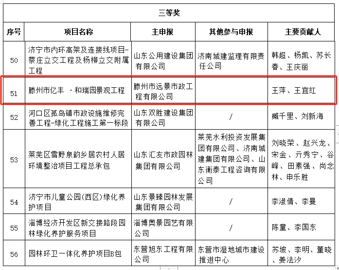 近日,山东省园林绿化行业协会、山东省建设建材工会组织开展的2024年度“园林优质工程”优秀成果竞赛活动评选结果揭晓,由远景公司承建的亿丰·和瑞园景观工程,荣获山东省园林绿化行业2024年度“园林优质工程”三等奖。这是继2023年后远景公司再次荣获该奖项。