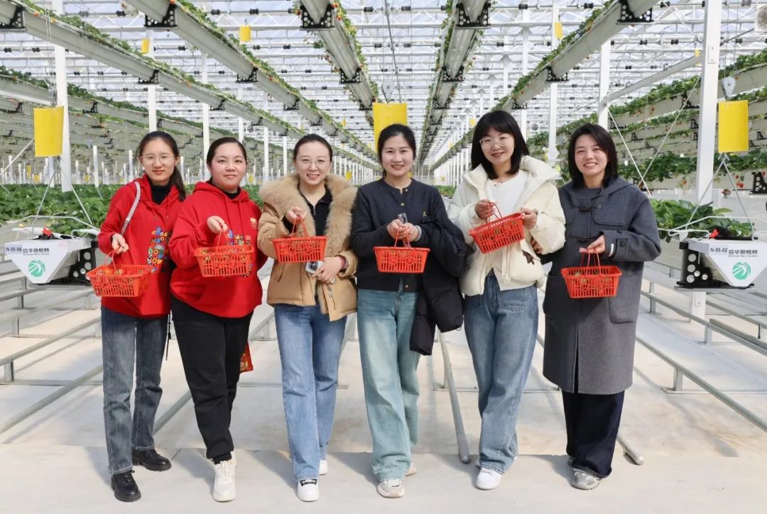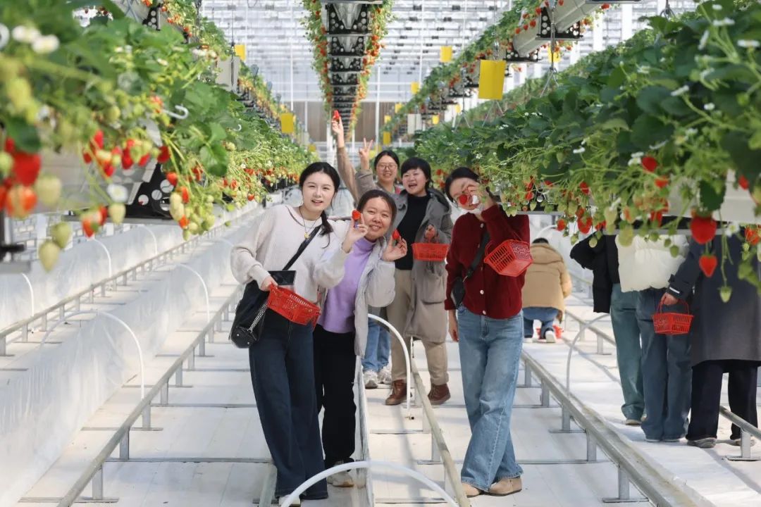 随后,在工作人员的引导下大家进入草莓温室,鲜红欲滴的草莓悬空的绿秧中若隐若现,红绿交映,生机勃勃,清新的草莓果香扑鼻而来。女职工们手提果篮,化身快乐果农,一边采摘品尝,一边相互交流,体验着采摘草莓、品尝鲜果的乐趣,每个人的脸上都洋溢着开心幸福的笑容。