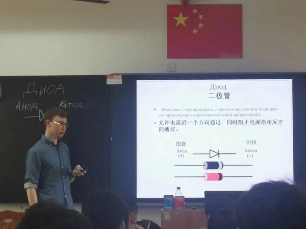 课上,外教伊万诺夫·维克多通过丰富的图片、动画和视频,展示了常用电子器件的原理、功能,让同学们领略到了俄罗斯的独特授课方式,带来了精彩纷呈的课堂体验。