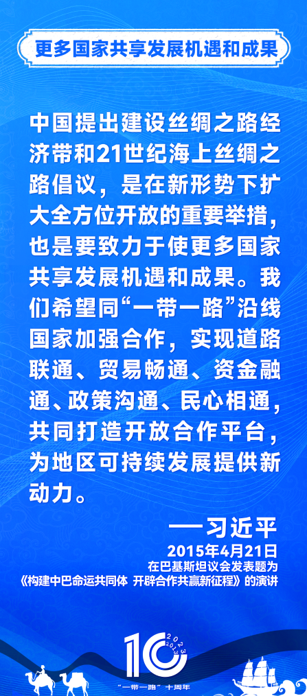 10年前,习近平主席提出共建“丝绸之路经济带”和“21世纪海上丝绸之路”,即共建“一带一路”倡议。过去10年来,习近平主席在多个场合发表讲话和署名文章,为世界描绘了共建“一带一路”互联互通、合作共赢的宏伟蓝图。