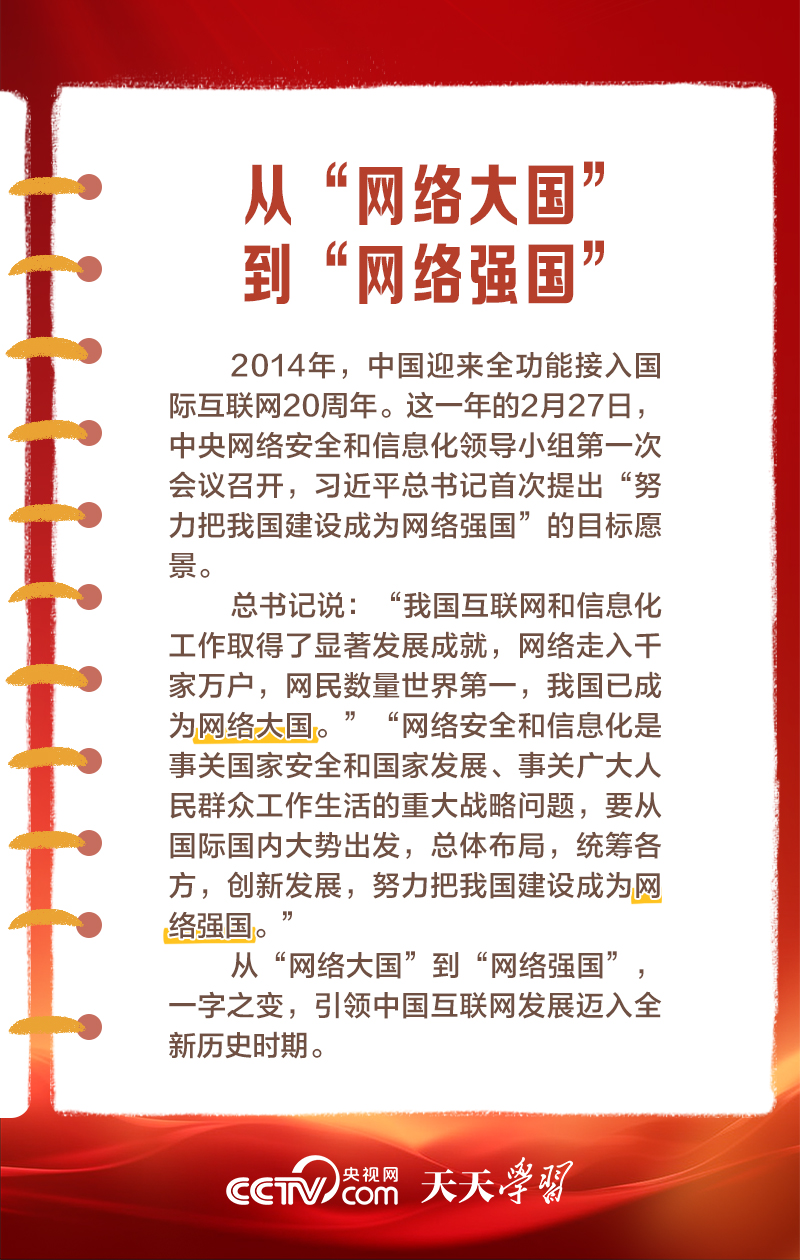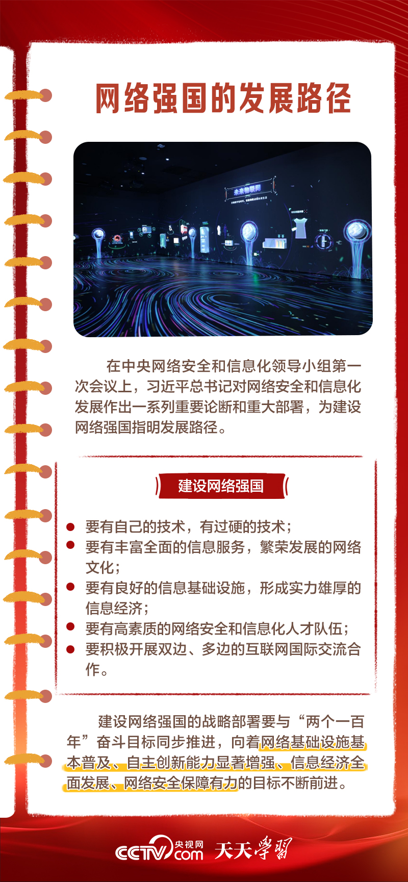 天天学习党的十八大以来,习近平总书记高度重视网络强国建设,在网络强国建设实践基础上,提出了一系列新思想、新观点、新论断,形成了关于网络强国的重要思想。在这一重要思想引领下,我国互联网发展进入全新时代,网络强国蓝图徐徐铺展。
