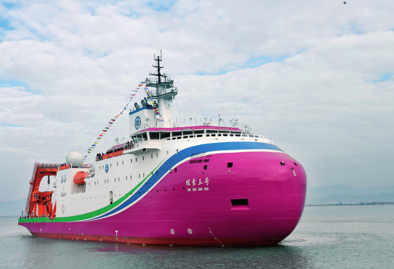我国首艘设计拥有 完全自主知识产权的深 远海多功能科学考察及 文物考古船“探索三号” 抵达三亚崖州湾科技城 的南山港公共科考码头 并 正 式 入 列(2024 年 12 月 29 日摄) 赵颖全摄 / 本刊