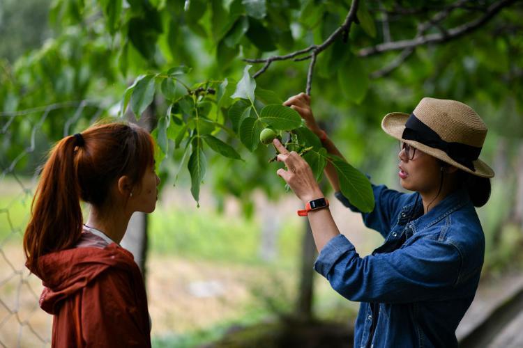 2023年7月27日,在西藏加查县安绕镇热果村,长江大学西藏高原核桃产业研究所刘利平博士(右一)在一株古核桃树下给学生开展现场教学。2021年3月,湖北省“十四五”科技援藏项目启动,刘利平跟随团队奔赴高原,全身心投入到当地良种选育、繁育以及栽培管理等工作之中。“十四五”期间,当地沿江生态走廊种植项目种植核桃10余万株,既固土防沙,又为当地群众带来收益,实现生态效益与经济效益双赢。