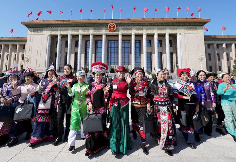 2024年3月8日,十四届全国人大二次会议第二次全体会议结束后,女代表在北京人民大会堂前合影留念。人大代表中妇女代表比例不断提升。2023年第十四届全国人大妇女代表790人,占26.5%,比第十二届、十三届分别提高3.1个、1.6个百分点。