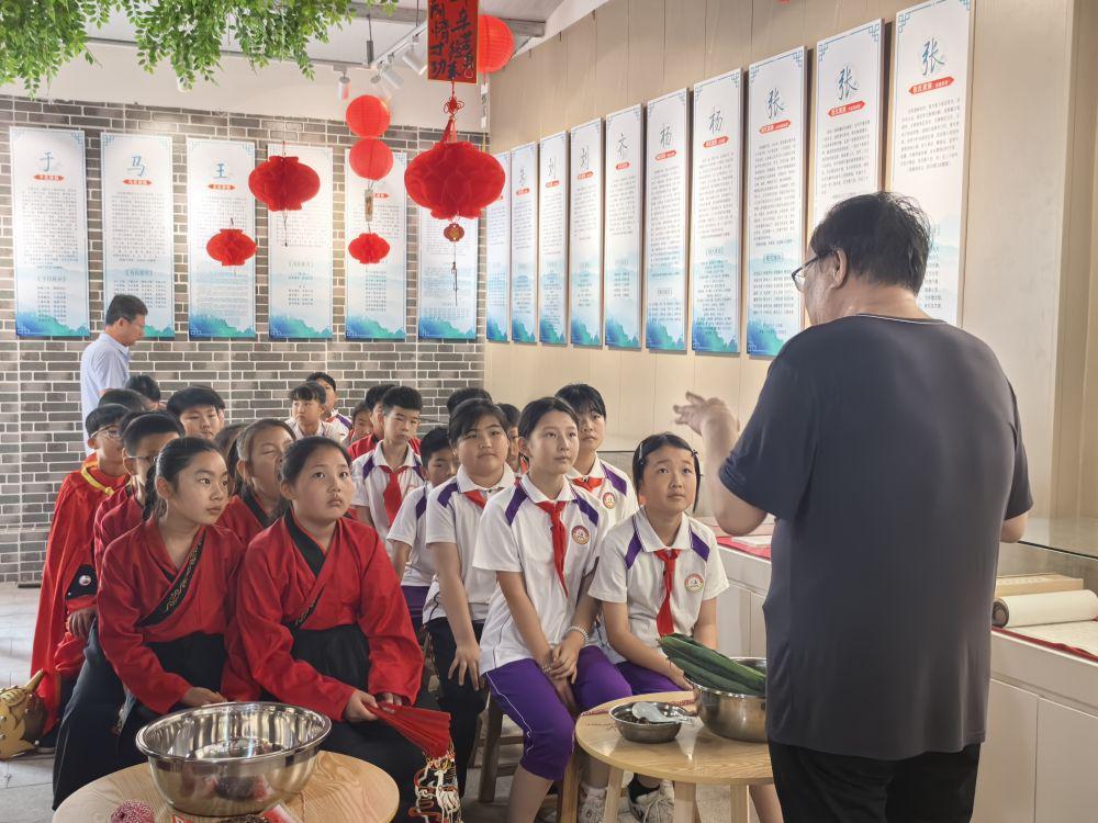吕官屯村退休教师胡毅在吕官屯村家风家训堂,给前来参观的学生讲家风故事(资料照片)。(受访者供图)