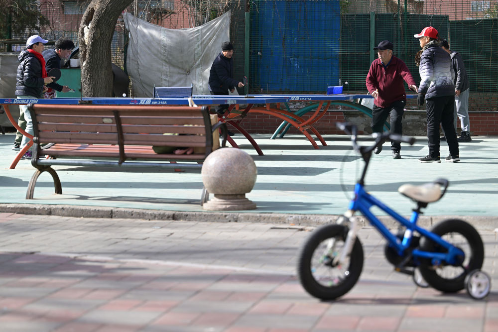 社区内,利用楼群间空地设置的乒乓球台等健身设施为附近的老年居民提供了便捷的健身场所(2月10日摄)。