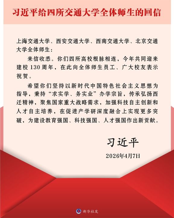 新华社北京4月7日电 近日,中共中央总书记、国家主席、中央军委主席习近平给上海交通大学、西安交通大学、西南交通大学、北京交通大学全体师生回信,对学校发展提出殷切期望。