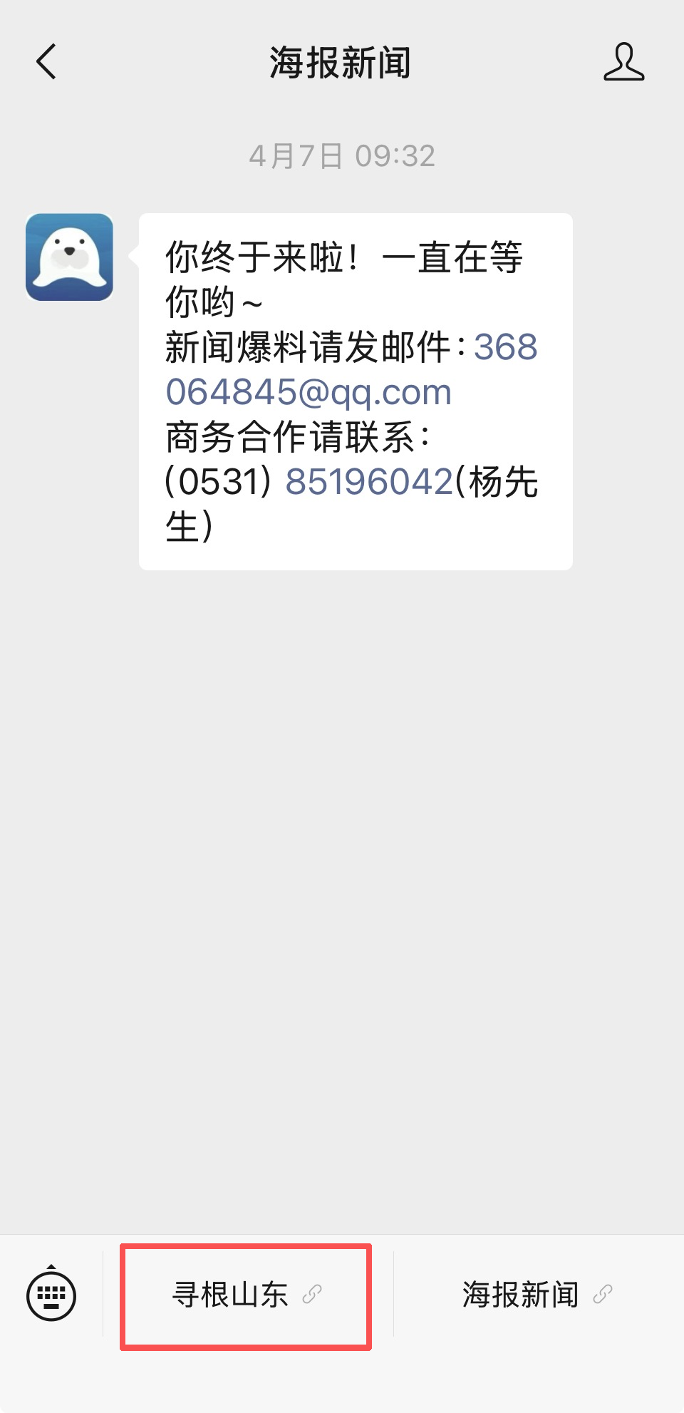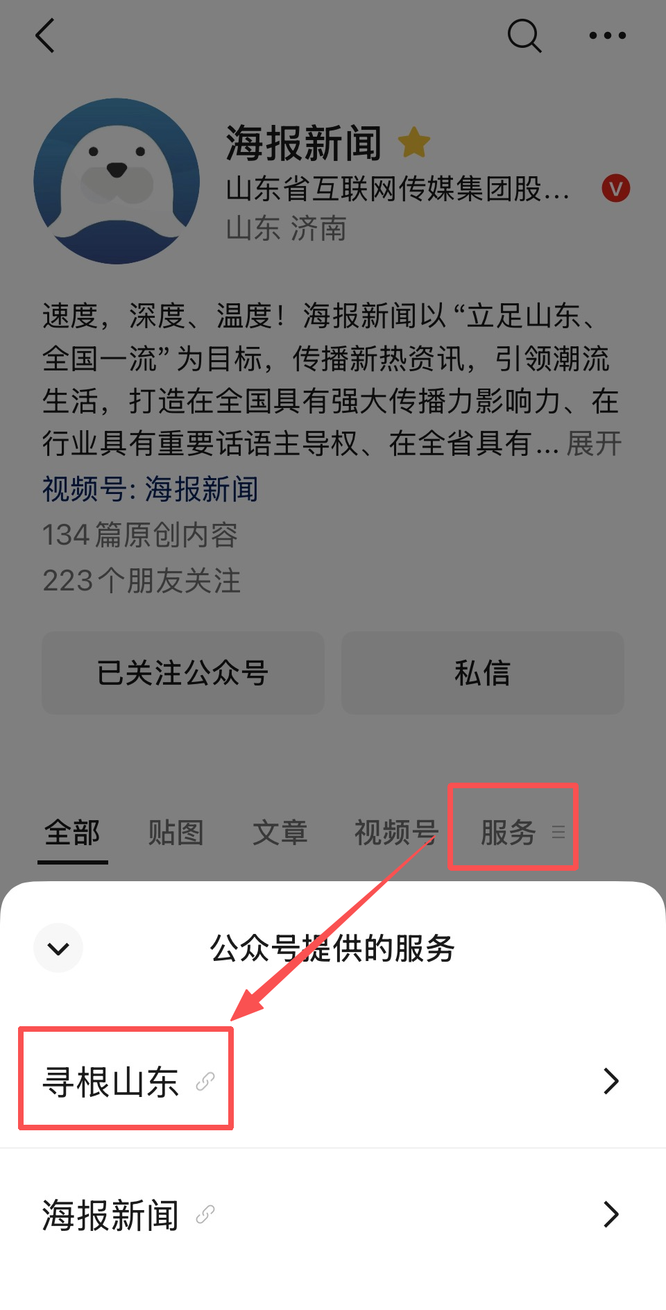 如果您已经关注“海报新闻”微信公众号,可以点击“服务”,在下方选择“寻根山东”。