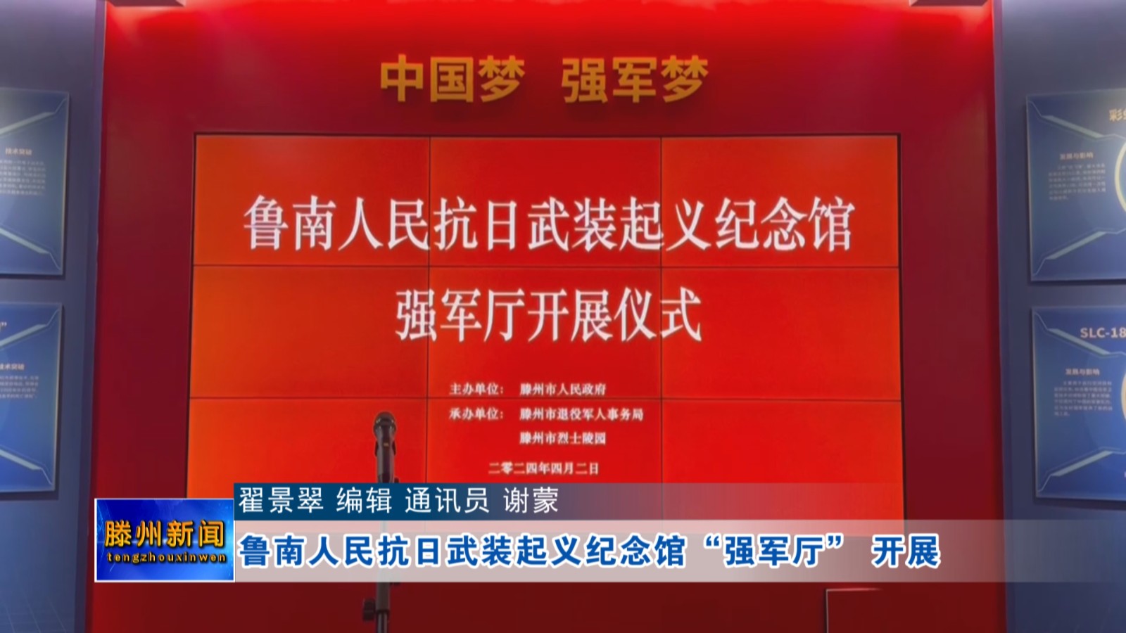 4月2日,鲁南人民抗日武装起义纪念馆“强军厅”开展仪式在滕州市烈士陵园(滕州国防科技教育基地)举行。海军南海舰队原副司令员、少将张兆垠,空军第七军原副军长、少将刘子贤,酒泉卫星发射中心原政委、少将王兆宇,滕州市副市长、市公安局局长李建峰,等参加仪式。
