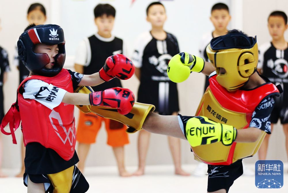 ↑7月28日,在山东省滕州市一家武术培训机构,小朋友们在学习散打。新华社发(李志军 摄)
