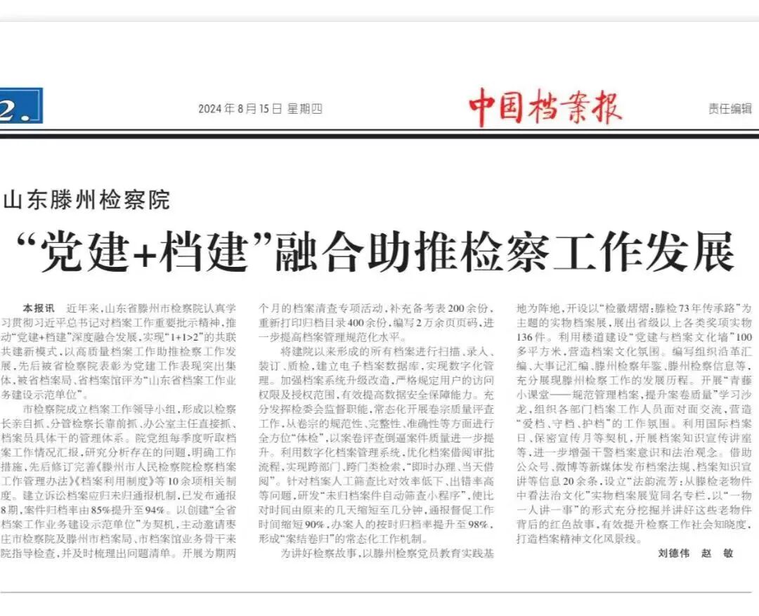 本报讯 近年来,山东省滕州市检察院认真学习贯彻习近平总书记对档案工作重要批示精神,推动“党建+档建”深度融合发展,实现“1+1>2”的共联共建新模式,以高质量档案工作助推检察工作发展,先后被省检察院表彰为党建工作表现突出集体,被省档案局、省档案馆评为“山东省档案工作业务建设示范单位”。市检察院成立档案工作领导小组,形成以检察长亲自抓、分管检察长靠前抓、办公室主任直接抓、档案员具体干的管理体系。院党组每季度听取档案工作情况汇报,研究分析存在的问题,明确工作措施,先后修订完善《滕州市人民检察院检察档案工作管理办法》《档案利用制度》等10余项相关制度。建立诉讼档案应归未归通报机制,已发布通报8期,案件归档率由85%提升至94%。以创建“全省档案工作业务建设示范单位”为契机,主动邀请枣庄市检察院及滕州市档案局、市档案馆业务骨干来院指导检查,并及时梳理出问题清单。开展为期两个月的档案清查专项活动,补充备考表200余份,重新打印归档目录400余份,编写2万余页页码,进一步提高档案管理规范化水平。将建院以来形成的所有档案进行扫描、录入、装订、质检,建立电子档案数据库,实现数字化管理。加强档案系统升级改造,严格规定用户的访问权限及授权范围,有效提高数据安全保障能力。充分发挥检委会监督职能,常态化开展卷宗质量评查工作,从卷宗的规范性、完整性、准确性等方面进行全方位“体检”,以案卷评查倒逼案件质量进一步提升。利用数字化档案管理系统,优化档案借阅审批流程,实现跨部门、跨门类检索,“即时办理、当天借阅”。针对档案人工筛查比对效率低下、出错率高等问题,研发“未归档案件自动筛查小程序”,使比对时间由原来的几天缩短至几分钟,通报督促工作时间缩短90%,办案人的按时归档率提升至98%,形成“案结卷归”的常态化工作机制。为讲好检察故事,以滕州检察党员教育实践基地为阵地,开设以“检徽熠熠:滕检73年传承路”为主题的实物档案展,展出省级以上各类奖项实物136件。利用楼道建设“党建与档案文化墙”100多平方米,营造档案文化氛围。编写组织沿革汇编、大事记汇编、滕州检察年鉴、滕州检察信息等,充分展现滕州检察工作的发展历程。开展“青藤小课堂——规范管理档案,提升案卷质量”学习沙龙,组织各部门档案工作人员面对面交流,营造“爱档、守档、护档”的工作氛围。利用国际档案日、保密宣传月等契机,开展档案知识宣传讲座等,进一步增强干警档案意识和法治观念。借助公众号、微博等新媒体发布档案法规、档案知识宣讲等信息20余条,设立“法韵流芳:从滕检老物件中看法治文化”实物档案展览同名专栏,以“一物一人讲一事”的形式充分挖掘并讲好这些老物件背后的红色故事,有效提升检察工作社会知晓度,打造档案精神文化风景线。