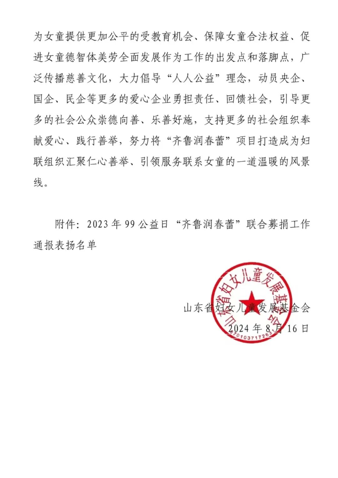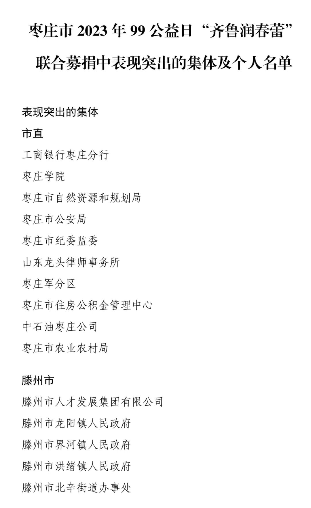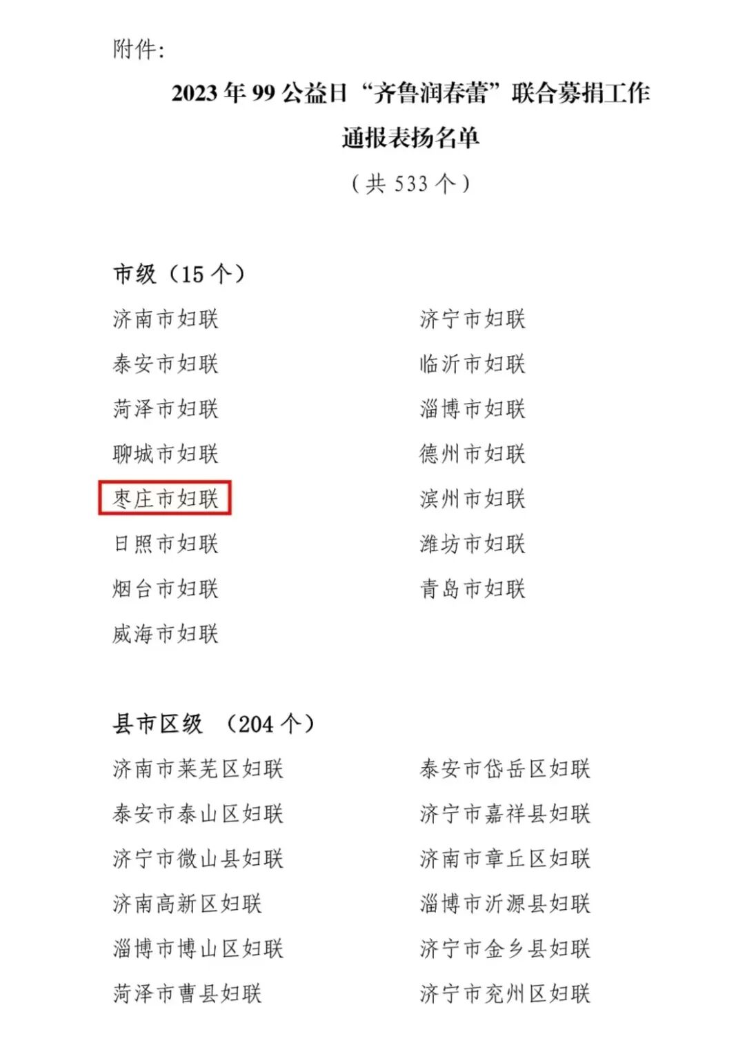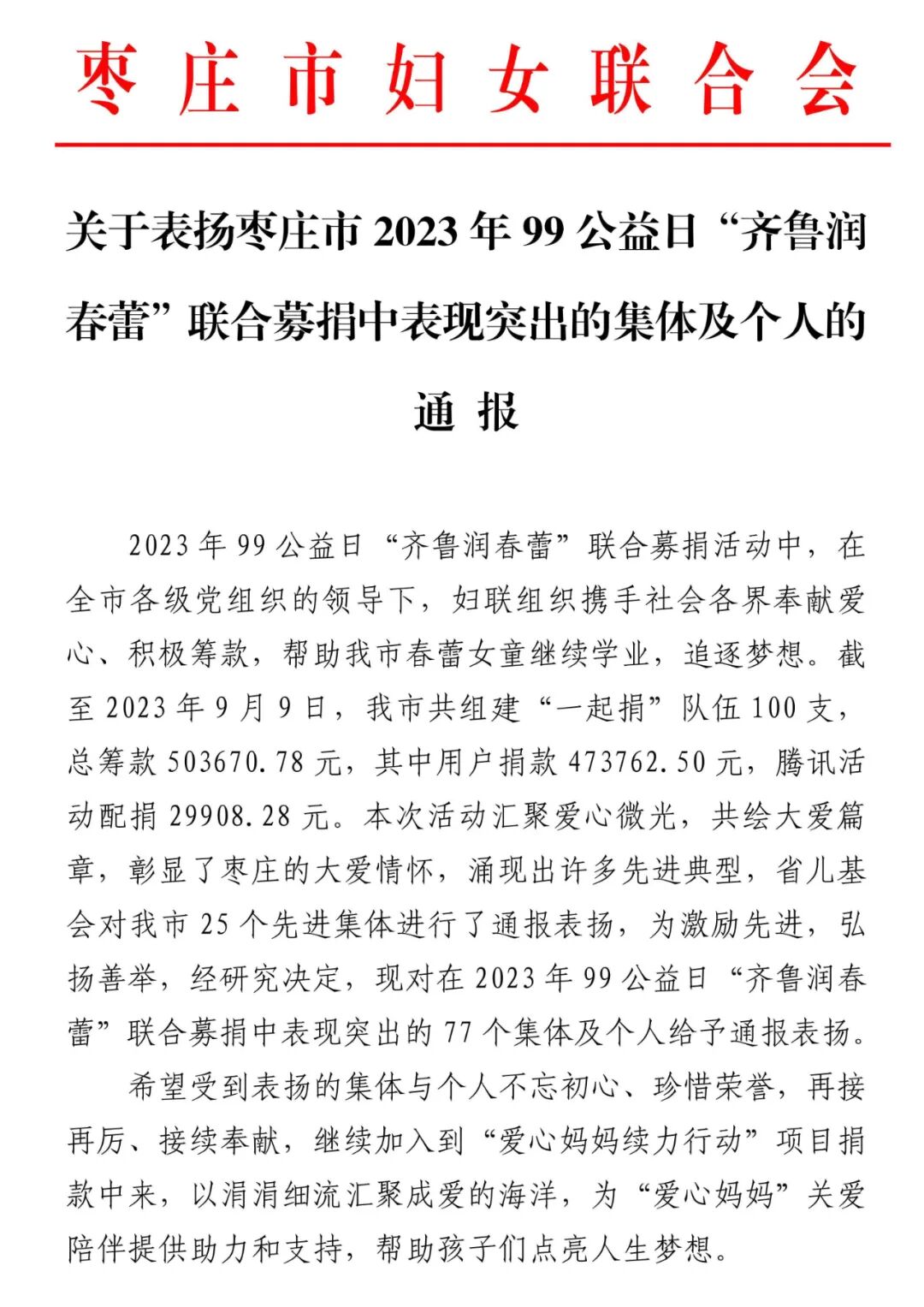 近日,山东省妇女儿童发展基金会、枣庄市妇联分别对2023年99公益日“齐鲁润春蕾”联合募捐工作表现突出的省、市先进集体、个人进行通报表扬,我市多个单位和个人上榜,现通报如下:
