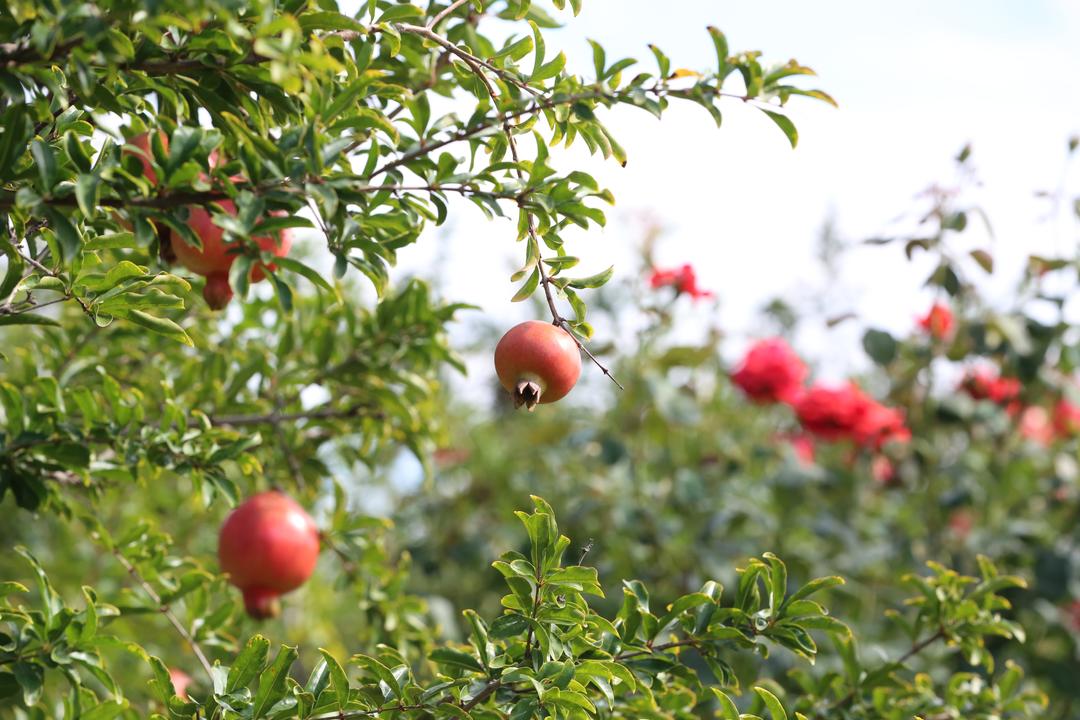走进峄城区石榴精品种植示范园内,各个功能区域错落有致,一棵棵石榴树整齐排列,枝头上挂满了大大小小的石榴果。示范园占地230亩,规划了连栋玻璃温室展示中心、七彩石榴温室大棚、石榴盆景园等多个区域。
