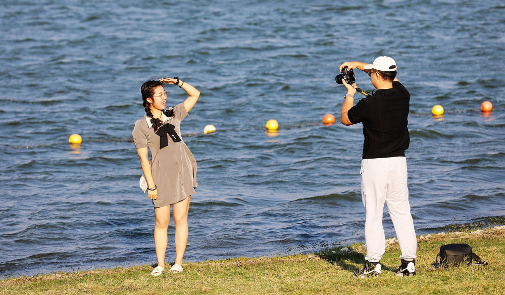 ↑9月21日,游客在滕州市“龙湖月色”乡村振兴示范区望湖公园游玩。