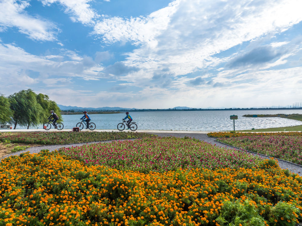 ↑9月21日,骑行爱好者在滕州市马河水库景区骑行。