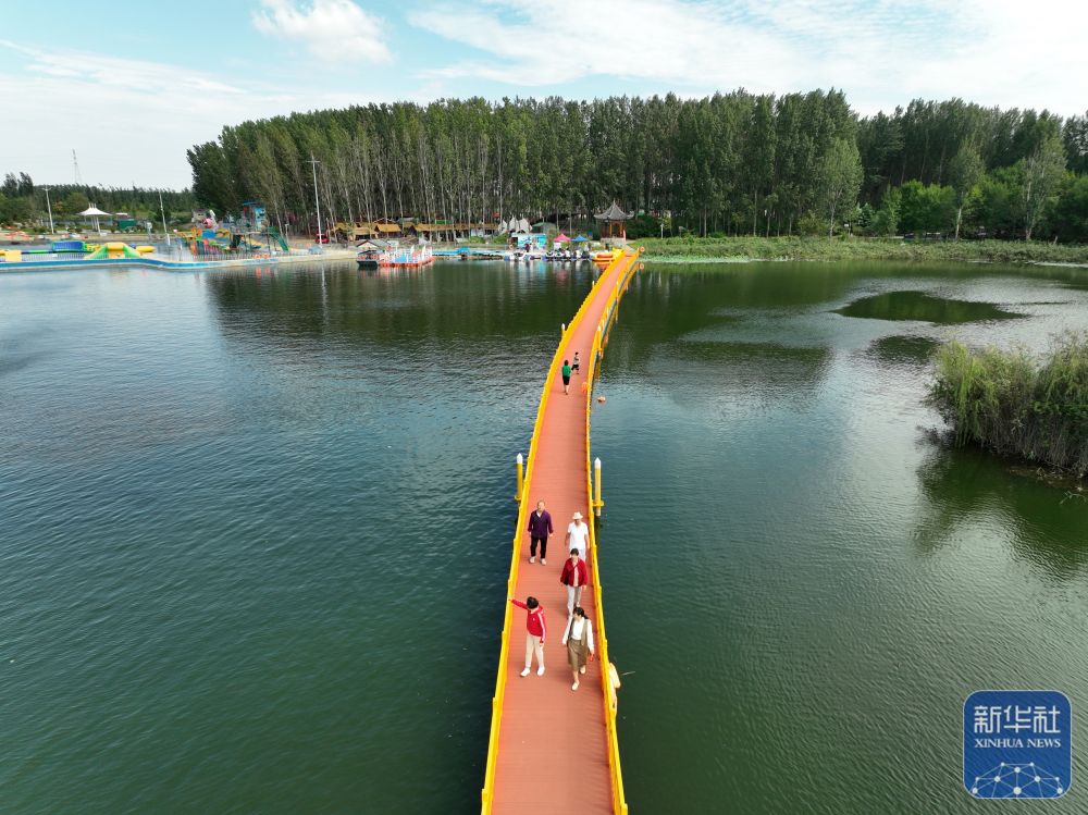 ↑9月21日,游客在滕州市西岗镇九龙湾湿地公园栈道上游玩(无人机照片)。