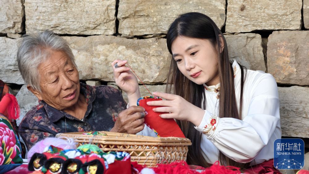 ↑9月21日,在滕州市南沙河镇北古石村,游客向传统手工艺人学习制作虎头鞋。