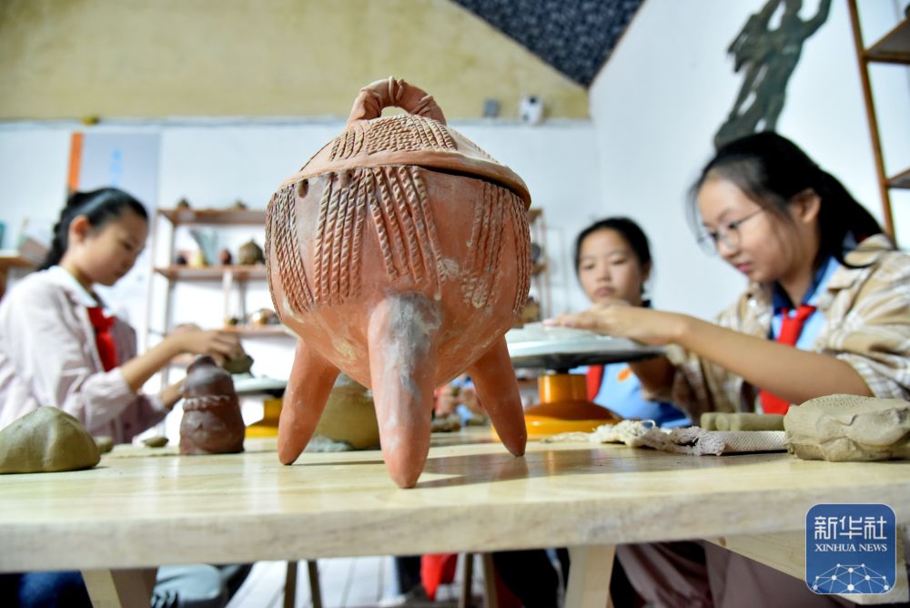 ↑9月21日,在滕州市官桥镇北辛土陶工坊,孩子们在学习制作土陶。