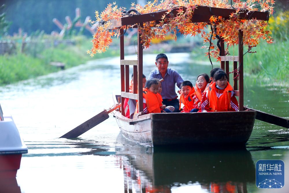 ↑9月21日,小学生乘船在滕州市滨湖镇下王村玩耍。