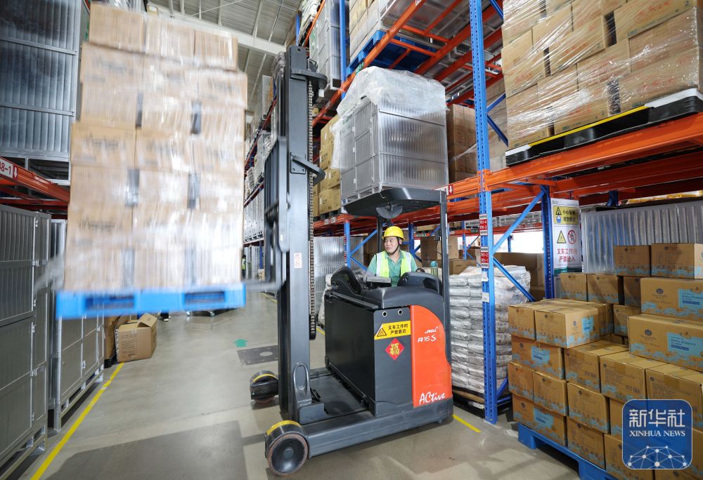 ↑9月21日,在山东省滕州市爱拉森医用品有限公司仓储内,一名工人驾驶叉车装卸货物。