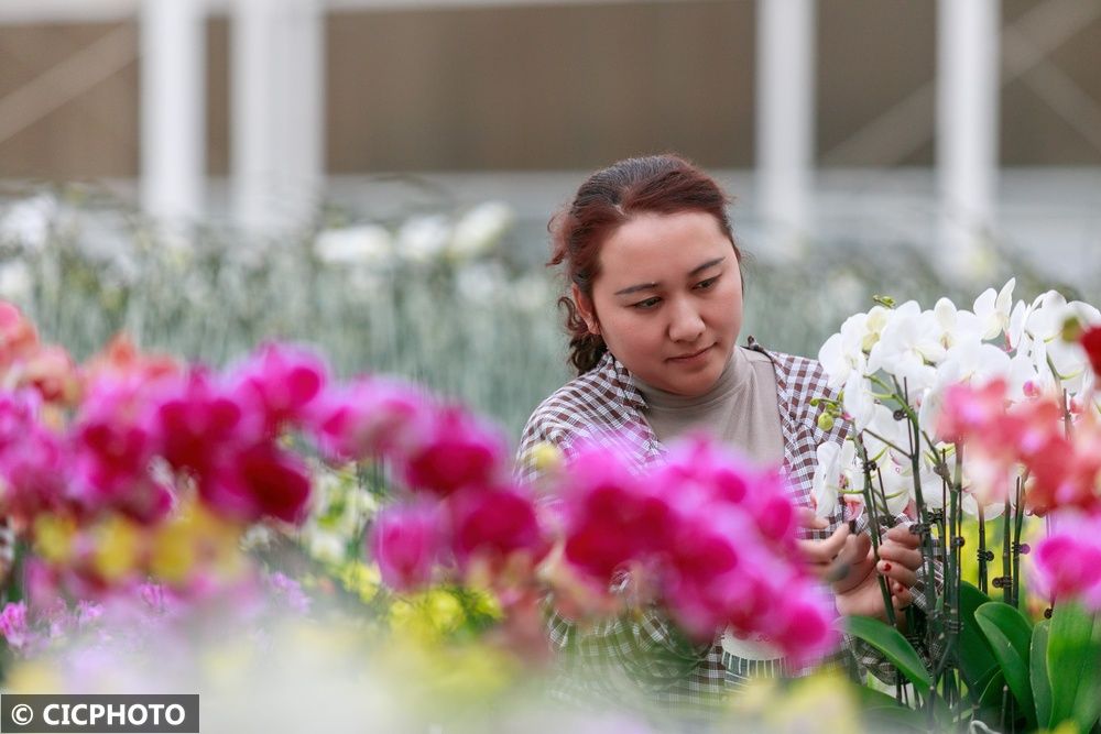 ↑2025年1月24日,山东省滕州市姜屯镇一家农业示范园种植基地的员工在管护蝴蝶兰。CICPHOTO/李立 摄