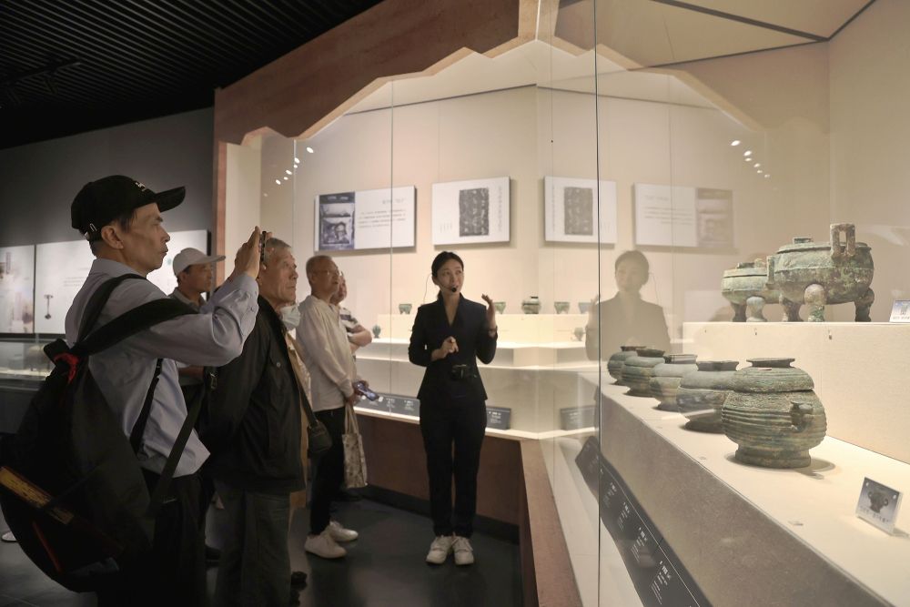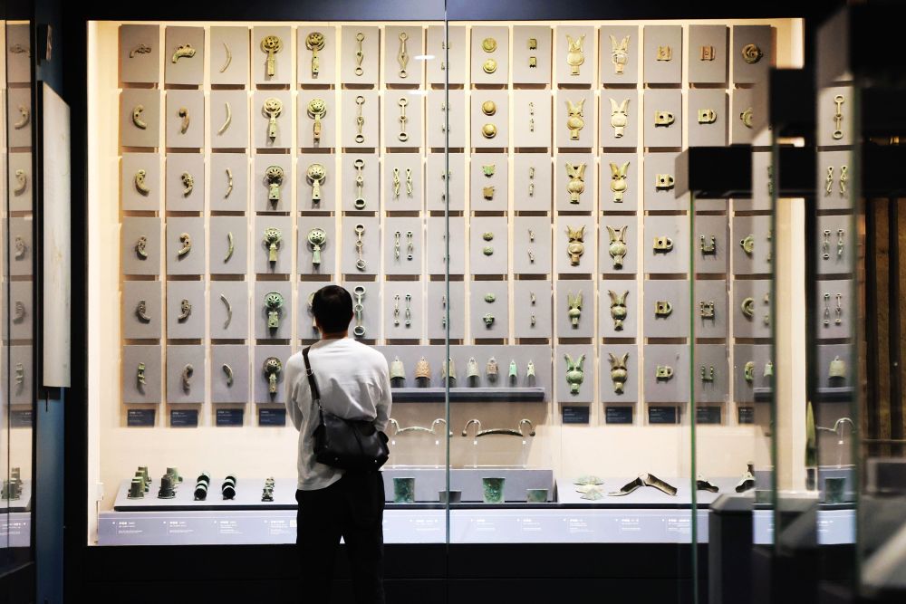 游客在滕州博物馆参观馆藏青铜车马器。车马器指中国古代马车上的配件,以青铜质居多。滕州博物馆馆藏车马器种类繁多、造型精巧,展现出商周时期高超的造车和青铜铸造工艺,也为研究当时的交通、军事、礼仪及社会等级等方面提供了重要实物资料。渠青 摄