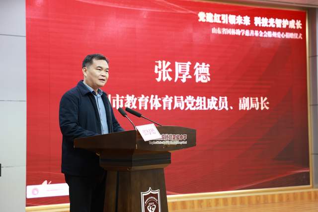 仪式最后,张厚德副局长发表总结讲话。他对本次捐赠活动的圆满举办及显著社会价值给予充分肯定,指出此次活动是党建引领公益事业、科技赋能教育发展的生动实践,为滕州基础教育高质量发展注入了温暖动能。同时,他呼吁更多企业、社会组织及爱心人士加入教育公益行列,凝聚多方合力,共同为滕州青少年的健康成长搭建广阔平台、筑牢坚实保障。