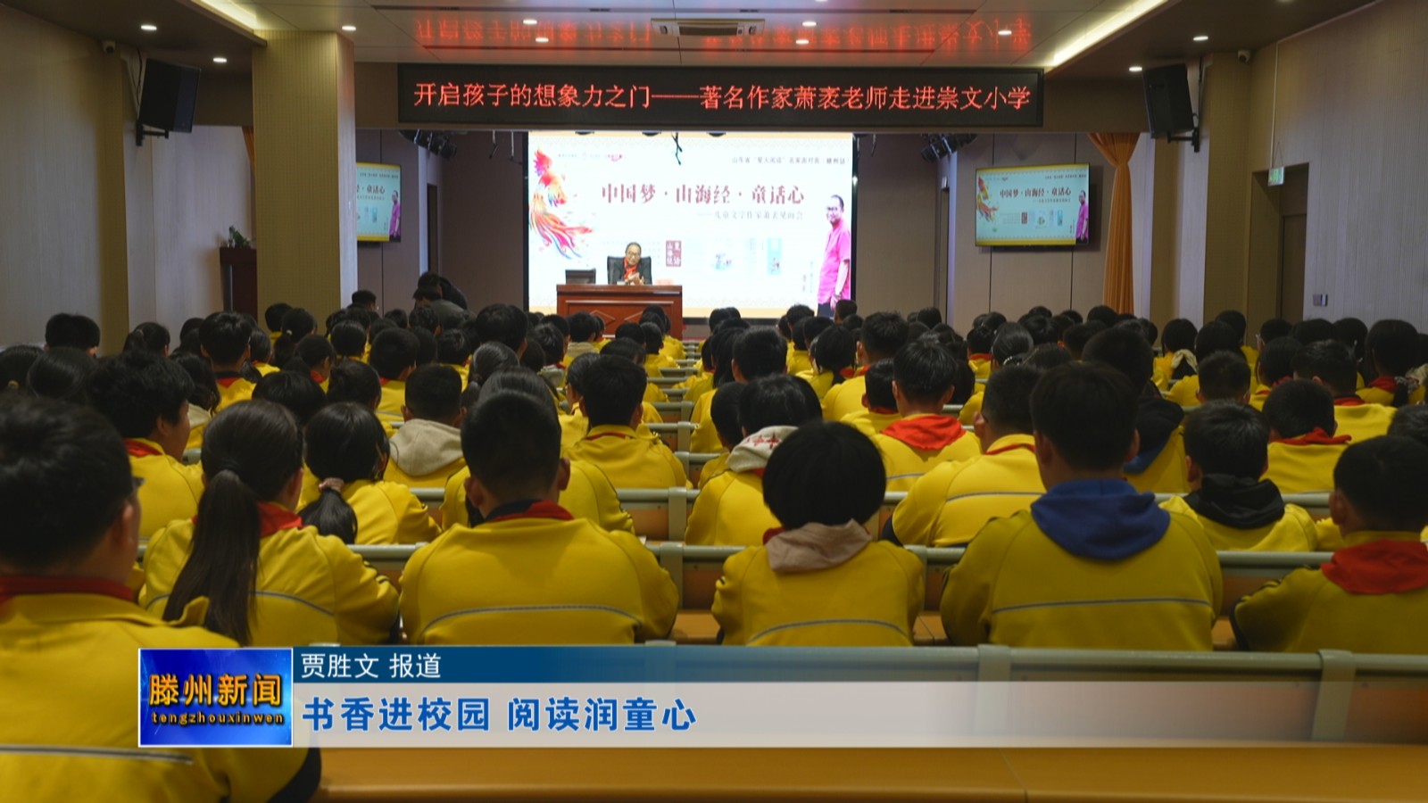 首届全民阅读活动周期间,著名儿童文学作家萧袤受邀走进滕州市崇文小学,与师生们面对面交流分享,以文学的力量点燃童心,为全民阅读推广注入温暖活力。活动现场,萧袤以“中国梦·山海经·童话心”为主题,用生动有趣的语言,给同学们分享了自己的创作经历、童话灵感来源,以及如何在生活中观察、积累素材,写出属于自己的故事。